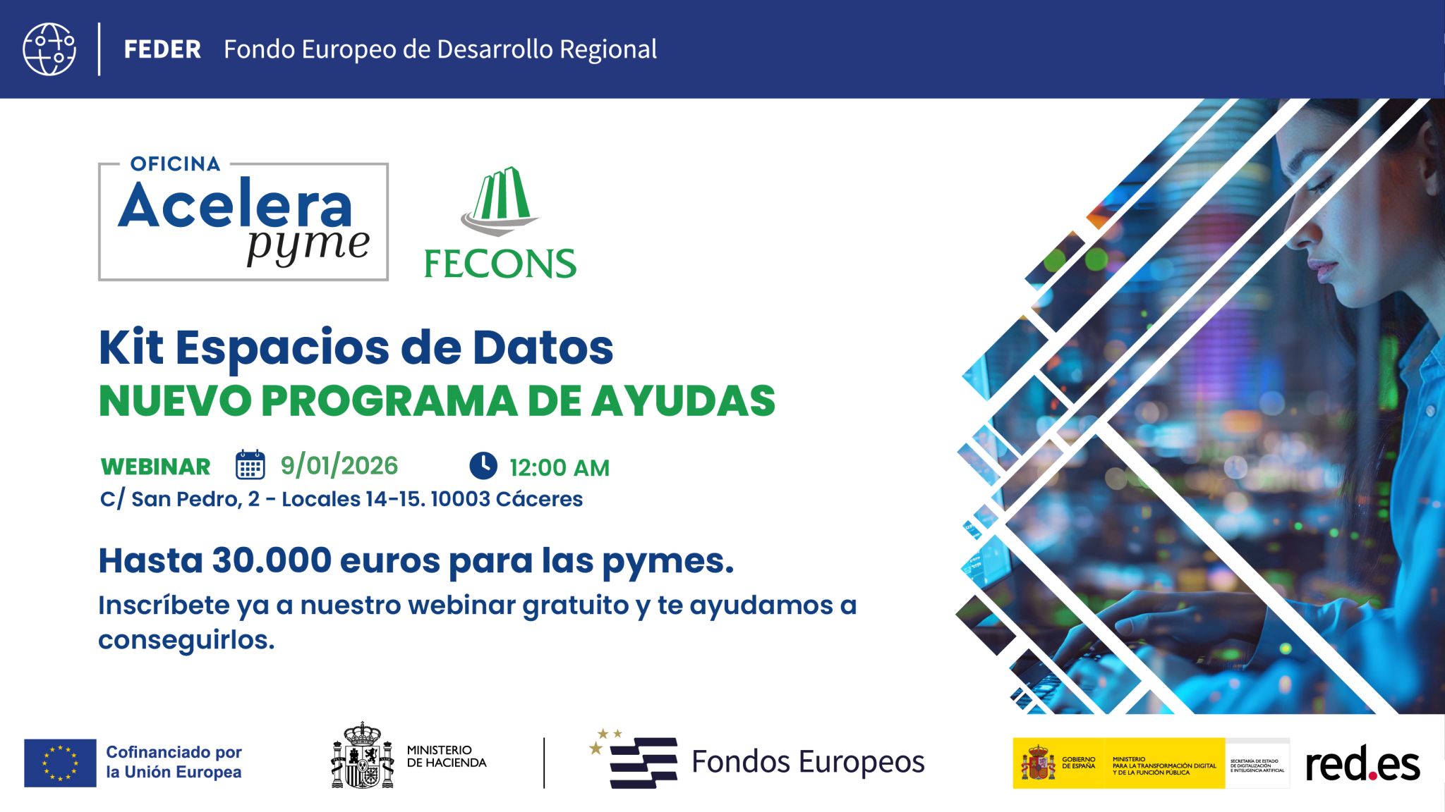 Te invitamos a participar en nuestro webinar , con asistencia presencial u online , donde te explicaremos qué es el Kit Espacios de Datos y cómo tu empresa puede conseguir hasta 30.000 € con esta nueva ayuda a fondo perdido.